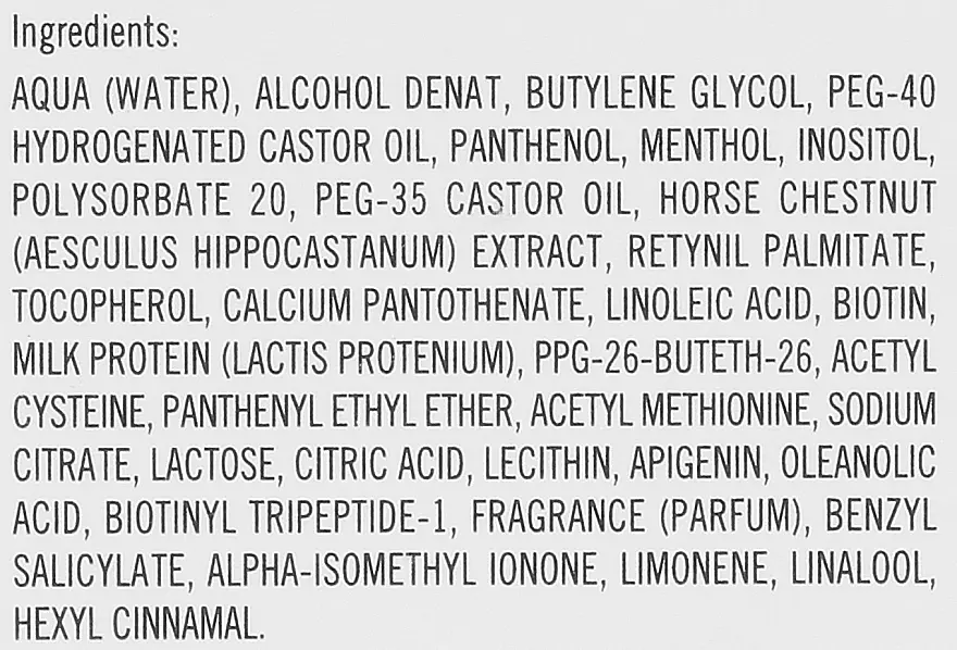 آب (Aqua)، الکل دناتوره (Alcohol Denat)، بوتیلن گلیکول، PEG-40 روغن کرچک هیدروژنه، پانتنول، منتول، اینوزیتول، پلیسوربات ۲۰، PEG-35 روغن کرچک، عصاره شاه بلوط هندی (Aesculus Hippocastanum)، رتینیل پالمیتات، توکوفرول (ویتامین E)، کلسیم پانتوتنات، لینولئیک اسید، بیوتین، پروتئین ملایم (لاکتیس پروتنیوم)، PPG-26-بوتت-26، استیل سیستئین، پانتنیل اتیل اتر، استیل متیونین، سدیم سیترات، لاکتوز، اسید سیتریک، لسیتین، آپیژنین، اولئانولیک اسید، بیوتینیل تریپپتید-1، عطر (فرگرنس)، بنزیل سالیسیلات، آلفا-ایزومتیل یونون، لیمونن، لینالول، هکسیل سینامال، BCC12-Base