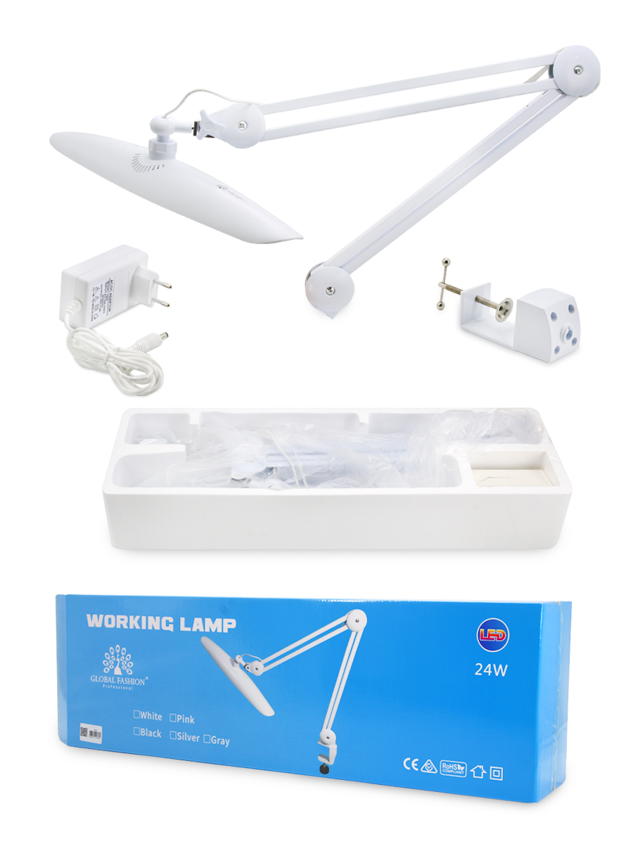 چراغ رومیزی Global Fashion 24W سفید با دو بازوی انعطافپذیر ۴۱۰ میلیمتری، نور LED قابل تنظیم و صفحهکلید لمسی، انتخابی حرفهای برای کاشت ناخن، مانیکور و استفاده روی میز کار است و دارای یک سال گارانتی میباشد.